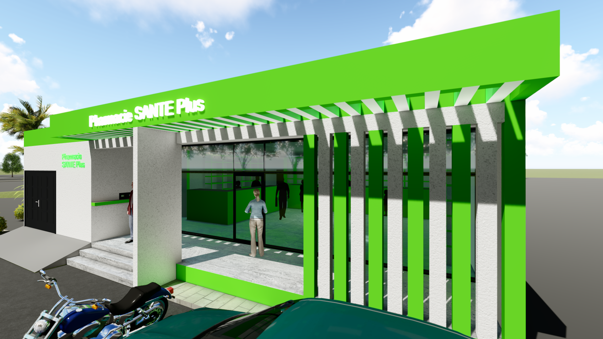 Plan d’une pharmacie sur un quart (1/4) de lot soit une surface 150 m² comportant :